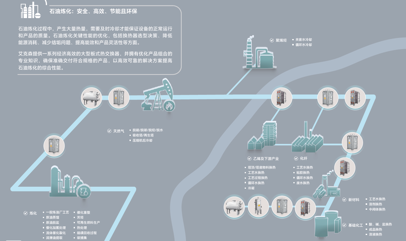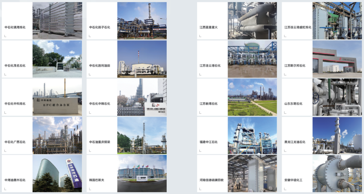 艾克森的換熱產(chǎn)品和應(yīng)用覆蓋了中石油、中石化等企業(yè)的各個(gè)下屬單位,還包括非三桶油的各類地?zé)捄褪髽I(yè)、包括中化泉州、中海殼牌、恒逸石化、盛虹煉化、衛(wèi)星石化、桐昆石化、寧波金發(fā)、煙臺(tái)萬華、山東聯(lián)泓、東明石化、魯清石化、中景石化、翔鷺石化、華錦阿美等知名企業(yè)的各個(gè)工藝段。