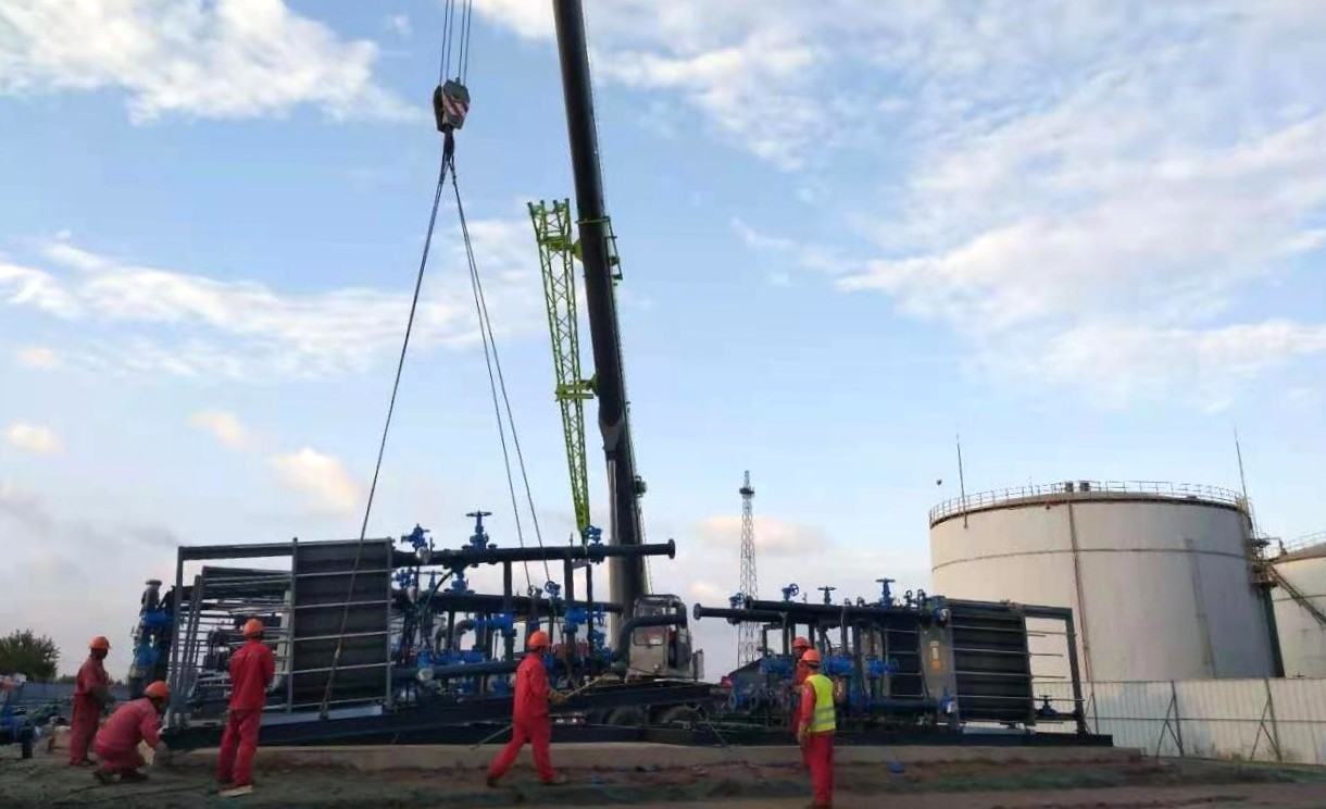 用于勝利油田河口采油廠義和聯(lián)合站污水余熱利用項目的工業(yè)換熱撬裝裝置是艾克森為勝利油田定制的系統(tǒng)集成產品。艾克森結合二十多年的集成產品和應用經驗,將原有項目的換熱器部件加現場安裝方式變成預制化集成撬裝整機交付,設備到場后僅需吊裝和管道連接,解決了聯(lián)合站防爆和快速交付需求,過程零動火施工同時實現了不停產改造;結合流體是含蠟量高、腐蝕速率高的復雜介質,采用高流通能力板型和耐腐蝕合金材料;面對井場可用面積小,艾克森優(yōu)化結構設計,并加裝自動反沖洗。經過艾克森技術團隊與用戶多次溝通技術交流,結合設計討論和技術論證及現場勘查,最終選用的MP/GU系列工業(yè)換熱撬裝解決方案,設備整體撬裝出廠,現場接管即用,施工風險歸零,換熱器采用特種合金板片+專利流道設計+自動反沖洗技術多項技術融合,解決聯(lián)合站內原油高含蠟流體難題,很好的滿足了項目長期穩(wěn)定和低能耗運行。